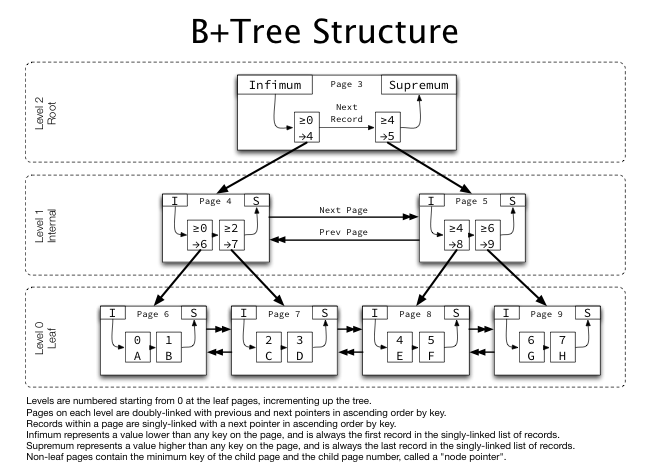 - 리프 노드들은 서로 연결되어 있다(Linked List). 이 특성으로 Range Scan을 효율적으로 만든다.