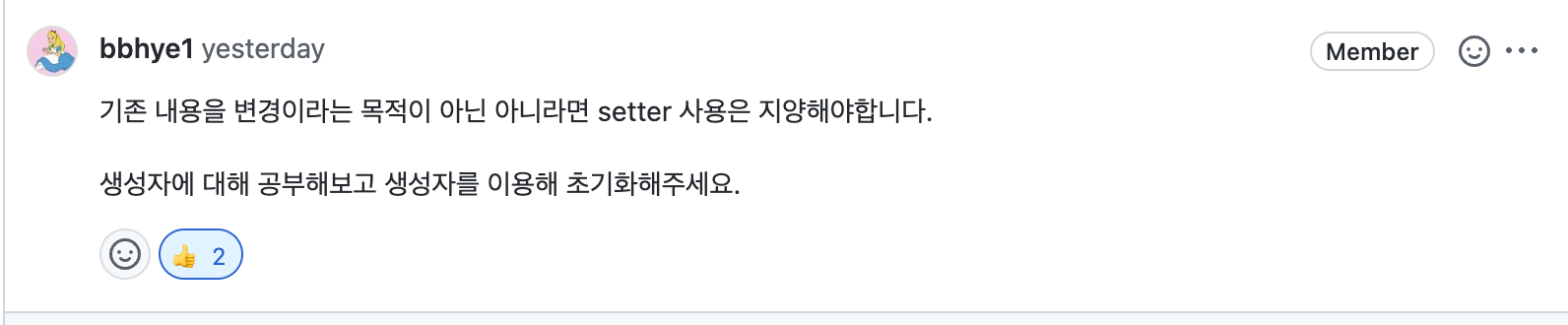 하지만 생성자를 사용하면 객체를 생성과 동시에 변수를 초기화해줄 수 있어 코드가 더 간결해졌다.