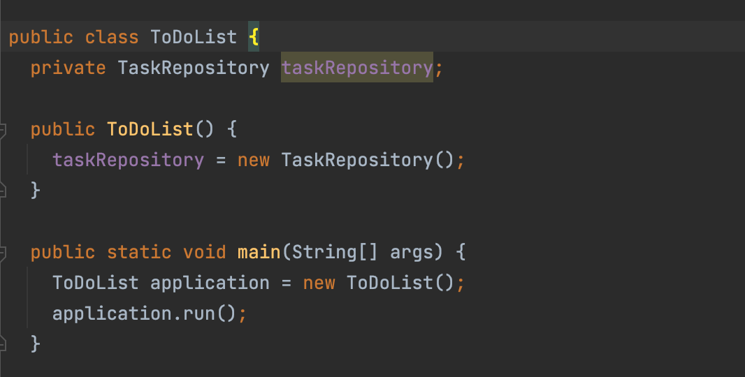 이것도 지금 만들고 있는 ToDoList 코드인데 여기서 보면 TaskRepository는 외부에서 생성된 클래스 파일인데 createToDoListButton메서드에서 사용하기 위해 이 메서드에 주입하고 있는 것을 볼 수 있다.
