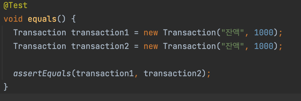 위 예시처럼 같은 값을 가진 객체를 비교해도 생성할 때 주소가 다르게 부여되기 때문에 주소가 달라서 테스트는 실패한다.
