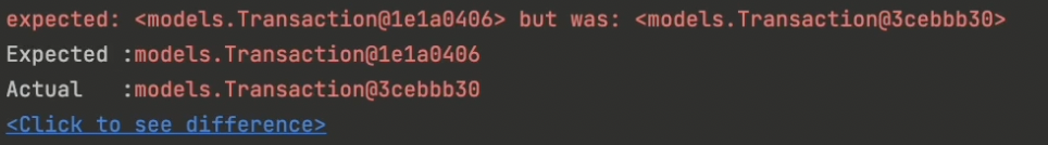 transaction2는 models.Transaction@3cebbb30 이 나와서 둘의 주소 값이 다르다는 것을 볼 수 있다.