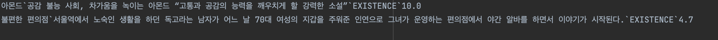 책의 정보를 담은 파일의 형태는 <책 제목>, <책 내용 요약>, <책 상태(존재, 삭제)>, <평점> 순이다.