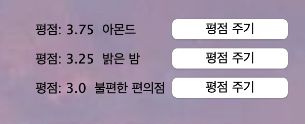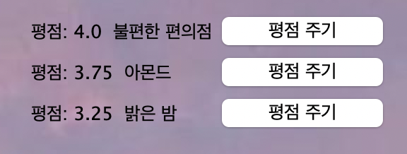 여기서 불편한 편의점에게 5점을 추가해주면 총 누적된 평점을 누적된 클릭수로 나눈 결과값이 나온다.