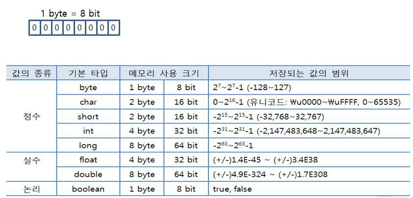- int → 32 bits (4 bytes) 정수형 Integer (정수)
